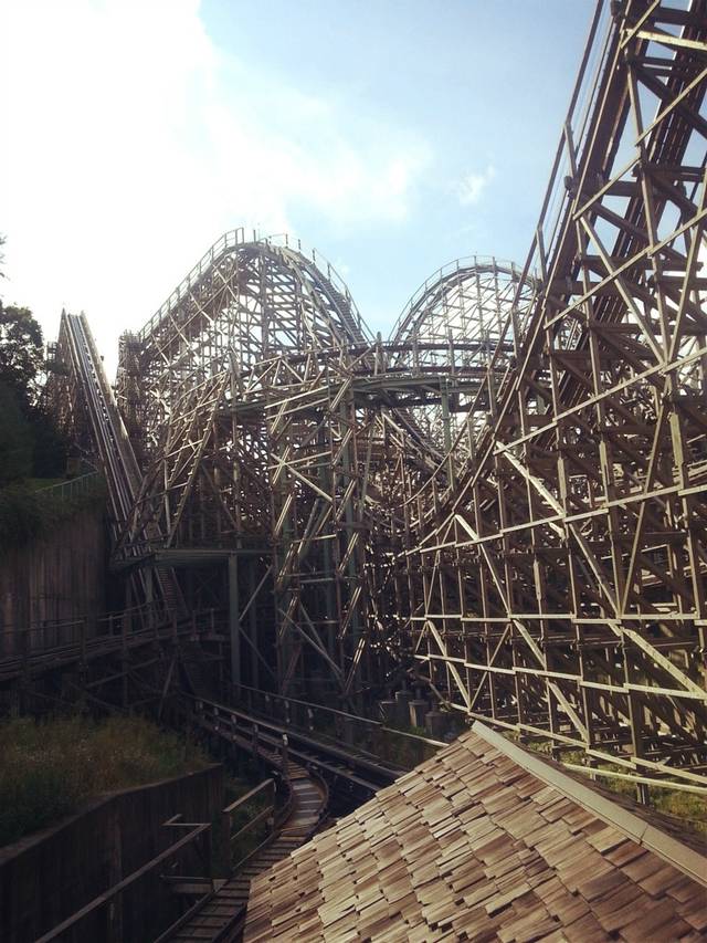 最后就我自己玩了一个项目之后,就去买吃的了。觅食的路上终于看到了这个,最大的木质过山车。看上去就好壮观啊。先领了Qpass预约,然后等了一个小时之后直接入场。