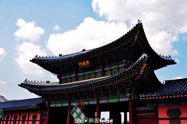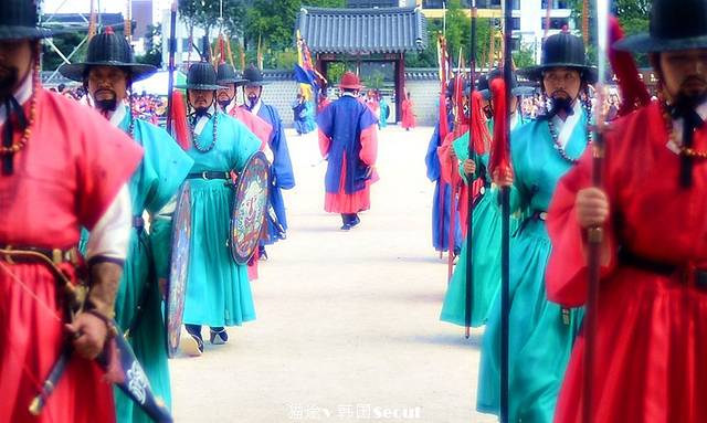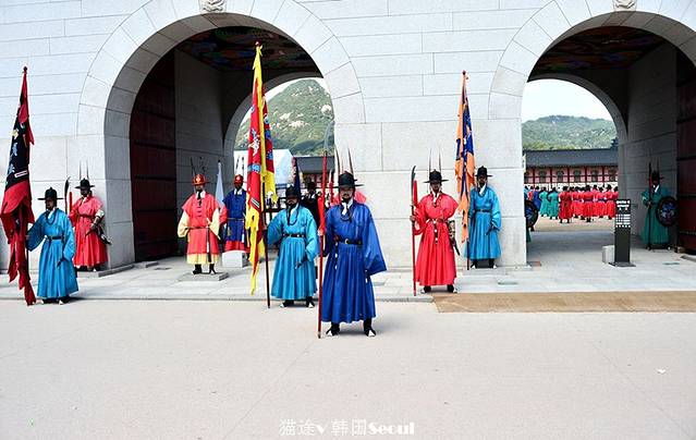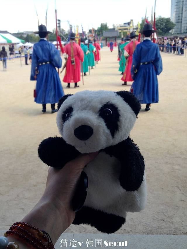 说到景福宫,光化门前的换岗仪式不可错过可以看到传统的仪式。我们本来计划赶上午十点场但被老妈搞乱,索性上午先去明洞换钱中午赶回来看一点场,时间掐的刚刚好出了地铁就赶上换岗仪式开始,熊猫范英俊先来一张:)