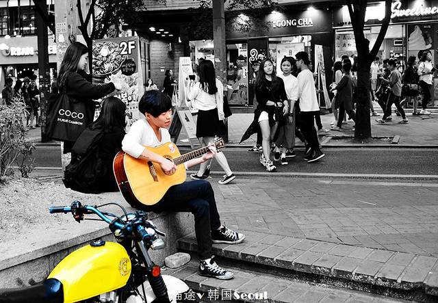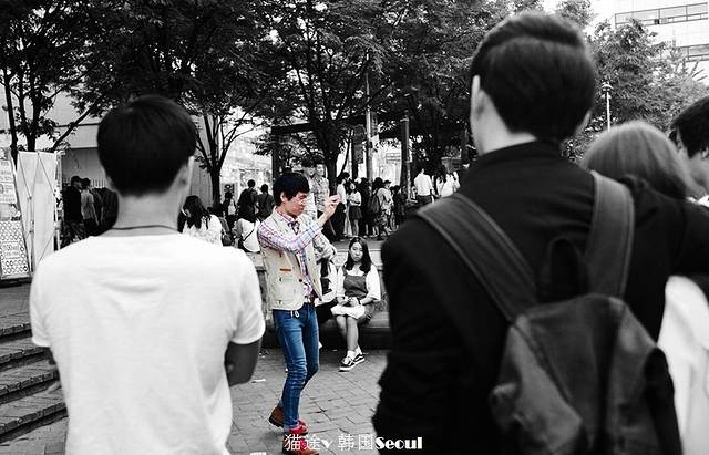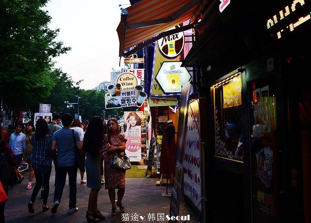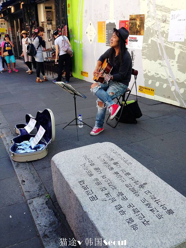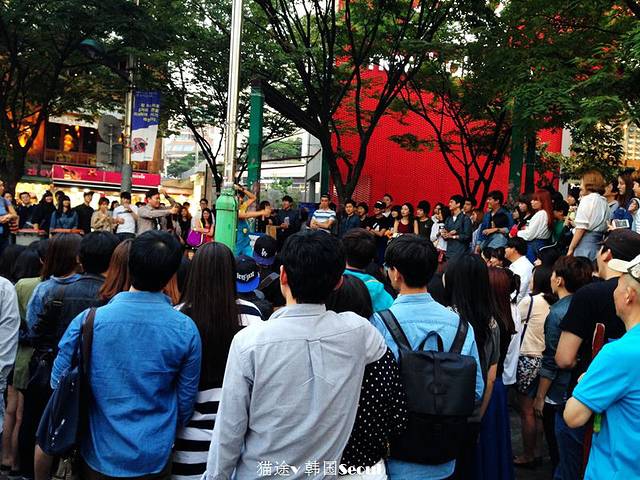逛完仁寺洞坐地铁直奔宏大,据说是帅哥云集的地方。宏大校园没有去,仅仅是在周边的商业街上就已经感受到了去这里的必要性,微博炫耀了一下就一堆美女开始垂涎。我们到了那里正是傍晚十分,街上有很多街头表演,据说这里是年轻艺术家的聚集场所,在首尔备受瞩目。这里妈妈很喜欢因为特别热闹,但好像真正的热闹要进入到夜店中才能体会,只个妈妈无法体会,年轻朋友来玩儿才可以深刻体会。
