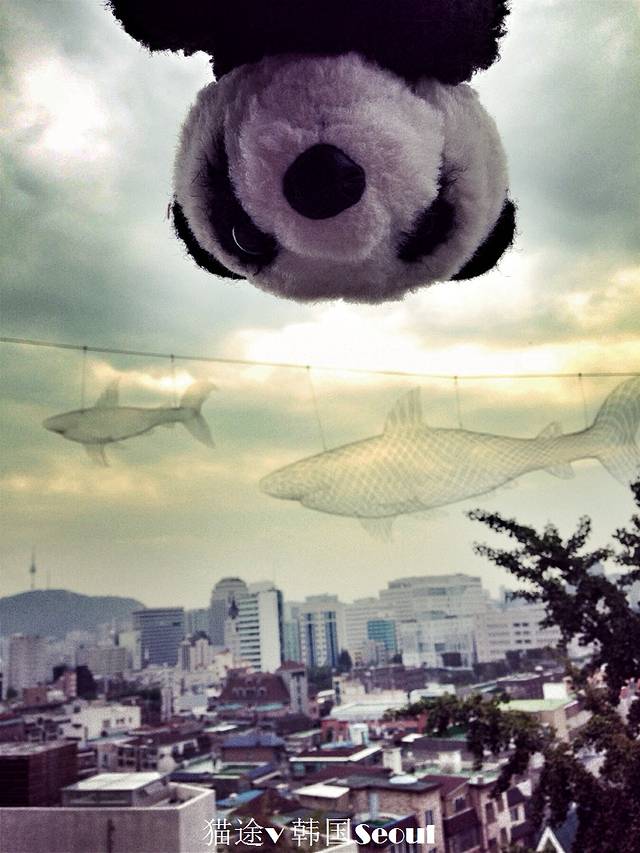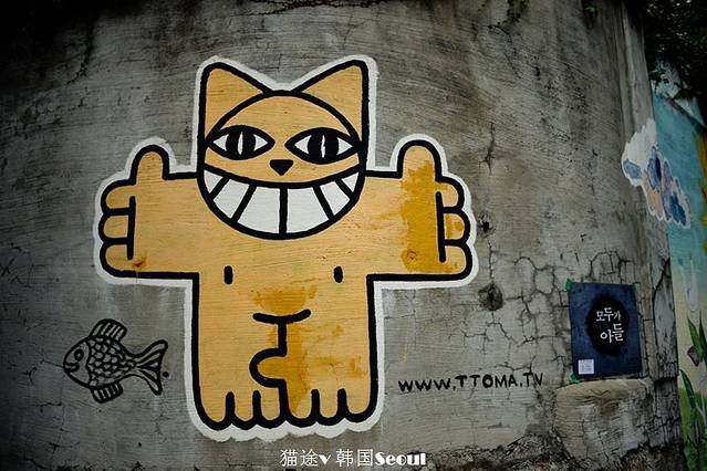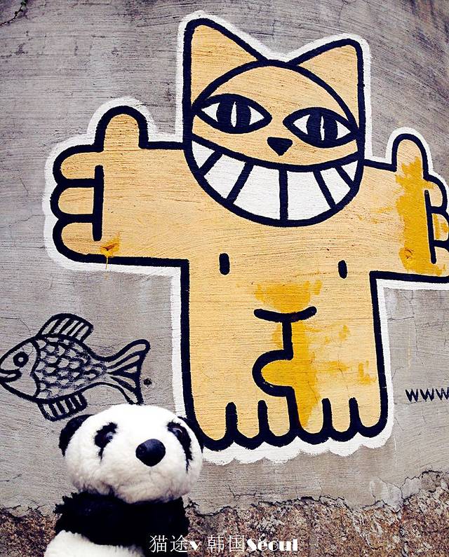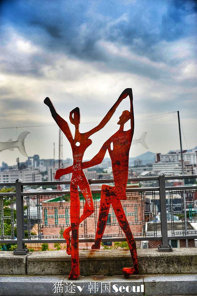 我们上午吃过早饭从东大门坐4号线一站地到惠化2号出口出来一只往前走,途经一个街头公园左转继续走就到看到了那只大脚趾猫咪。顺着它脚趾的方向走就是你要去的地方了。来到这童鞋们记得一定要穿上一双好爬楼梯的鞋子,首尔真是楼梯无处不在。去壁画村途经骆山公园,因为有着地理的优势和美妙的景观,这里是鸟瞰首尔大学路风貌的绝佳之地,《屋塔房王世子》、《KING2HEART》曾经也此地城廓取景。