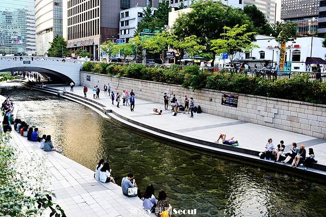 从光化门广场一直沿途走下去,无意中发现清溪川,好在之前在游记上看过一眼不然就这样错过了,正好赶上傍晚十分,日落余晖洒在溪水上,一组乐队正在演出,对面隔溪而坐一排年轻观众,特别想冲下去加入其中,但要顾及到对此没有兴趣的老妈就慢慢走过了。