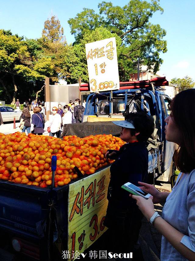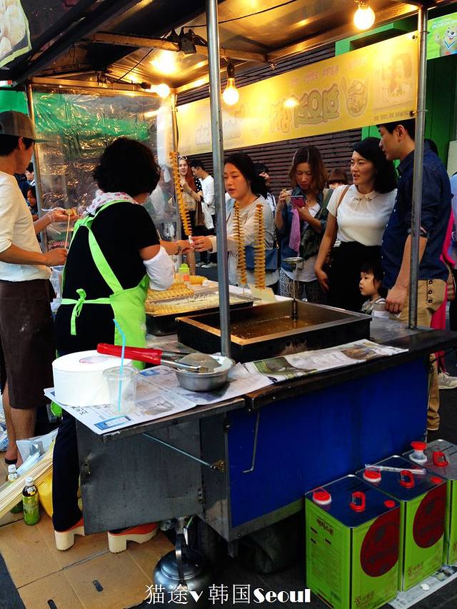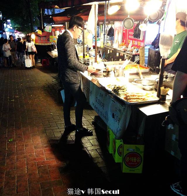 地铁到大学的路上摆满了小摊位,卖小吃的和卖小商品的,吃路边摊应该是所有韩国人都喜欢的事,穿这么正式的吃也不觉得奇怪。