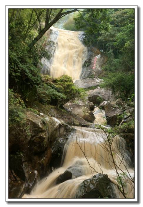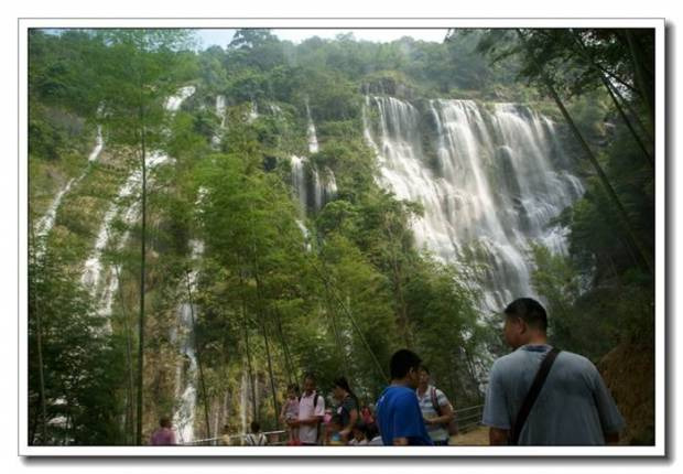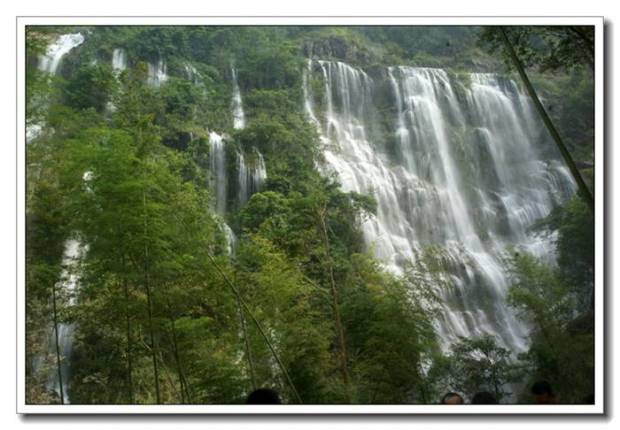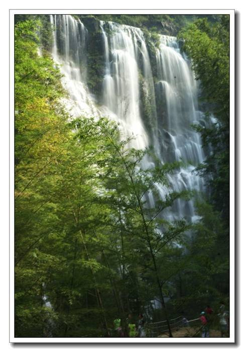 又绕过几道弯后,我们终于在竹林间隙中看到了大瀑布的身影,听到了瀑布那宏亮的哗响。再往上行,一面石壁陡然横亘眼前。右边是宽大的银瀑从壁顶直挂下来,轰然巨响。落差达80米。千泷山瀑布的宽不是整条瀑布的宽,而是在主瀑布旁边相衬着数条细瀑,如银带般写意地划在石壁上。于是,这有主有次,有刚有柔,有宽有细、飘洒恣逸的千泷山瀑布便有了它自己的个性。