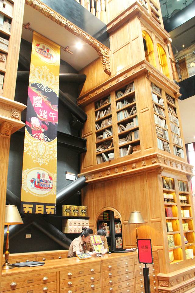 骤眼看,你以为自己走进一个偌大的图书馆,因为店内楼高十多米书架由地下摆至天花板,气势非凡,可谓台中新地标﹗但看真一点书柜上的并不是真的书本,而是各种蛋糕、饼干,以日式怀旧的盒子盛着,美到爆炸﹗