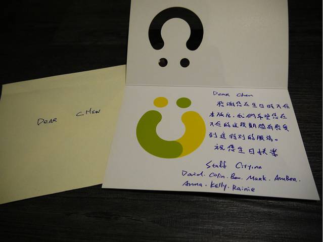 借由入住的旅店(一台湾朋友告诉我,她们习惯把酒店叫做旅店或者饭店,酒店这个词在台湾人心中,是代表不太好的场所,好吧,我就入乡随俗了)送给我的贺卡来祝福我自己:生日快乐!