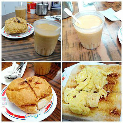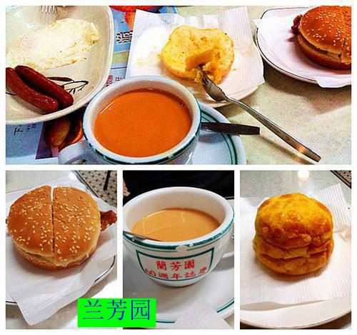 兰芳园丝袜奶茶、猪扒包、菠萝油、早餐A……。猪扒超好吃,中间夹了块大大 的猪扒,味道特正。菠萝油也很香(就是容易腻)。