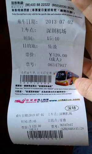 出发前一到两天在淘宝上购买的中港通车票,每人77元(单程),网上付款后,把电话和姓名告诉卖家,卖家会告诉你在哪里取票,记好他们的电话,热线电话是400-8822 322,下了机以后如果你在机场A号楼就是10号柜台取票,如果在B号楼就是04号柜台取票,出示有效身份证就可以取票。到了深圳湾后所有乘客取完所有行李下车过关,如果过关时间来得及,就可以坐回原来的车,如果来不及,可以凭着车票再坐下一趟巴士,票是当天有效。