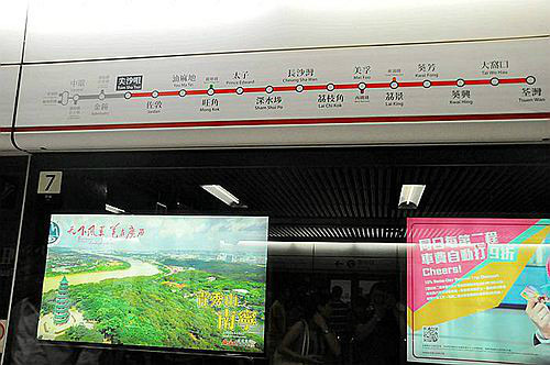 我们要坐红色的荃湾线,中环至荃湾的。途经尖沙咀——佐敦——油麻地——旺角——太子——深水埠等地。