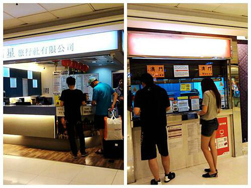 在左边明星旅行社柜台购买澳门船票150元,在右边专柜买159元,多了9元,我们选择左边旅行社柜台。