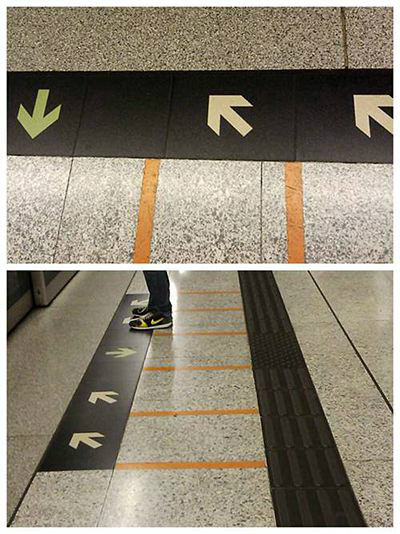注意下 图,地铁站出来箭头都标有方向,箭头向外是出,向内是入地铁,进出分开两条道走。