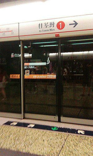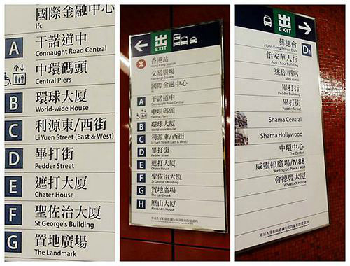坐地铁往中环方向走,香港地铁进出口地板都标有进出的箭头。