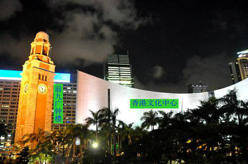 钟楼右边的白色墙体部分的建筑就是香港文化中心。