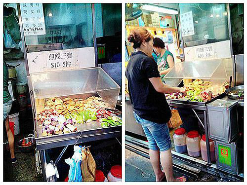 香港著名街头小吃之一的煎酿三宝,其实也就是我们平时的青椒、茄子酿野一样。