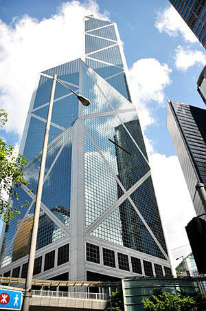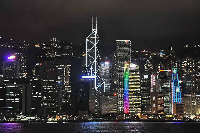 夜幕下的中环建筑群,最显眼当属中国银行大厦