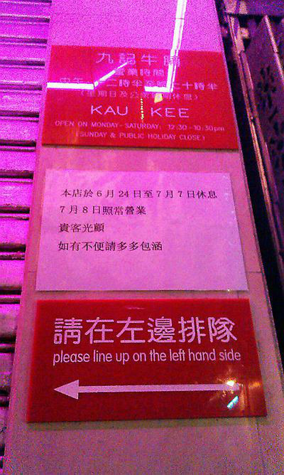 ,九记牛腩居然也不开门营业,老板休息了半个月,估计全家去旅游了。跟我同行的有几个路人也是到九记牛腩,每个人到了门口个个调头走了,可想而知他这家店多么受欢迎,老板说在全香港只做好一家店,不开分店。