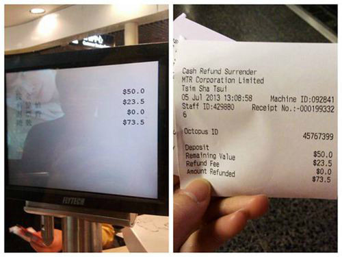 八达通剩余的钱会退还给使用人,退回73.5元给我,好像没扣我的押金哦。