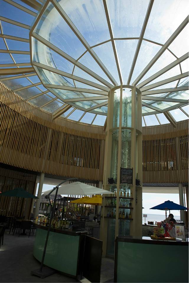 度假村的大堂就位于棕榈树的树根处,登记后我们的行李就被服务员送到房间,而我们则悠闲的喝着饮料欣赏度假村的风景。乘坐上电动车,在笔直的树干上向着度假村最中心的位置前进。