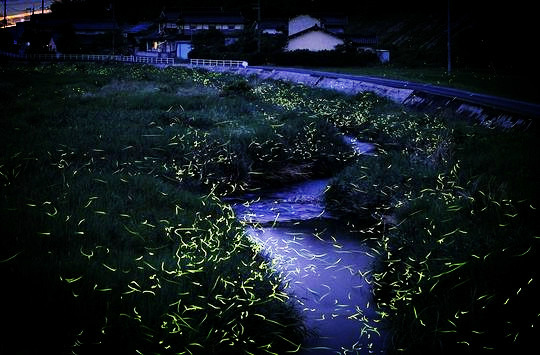 因为刚下过雨,所以萤火虫全都在落在树上,我们撑着伞,坐在湿漉漉的船上,在暗黑的河流上飘着。