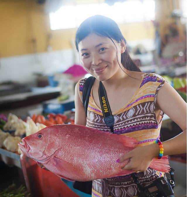 看到很多之前没有见过的鱼,开心的拍照。这时老板从箱子里抱出一条大鱼展示给我们看,让我们拍。