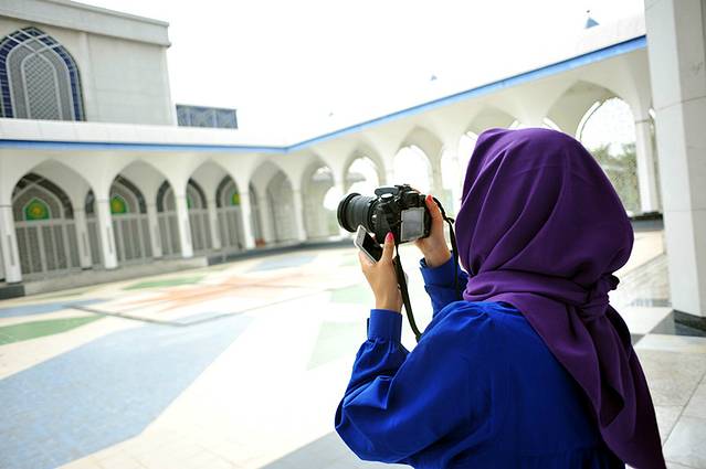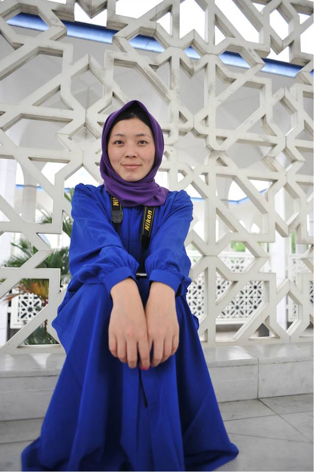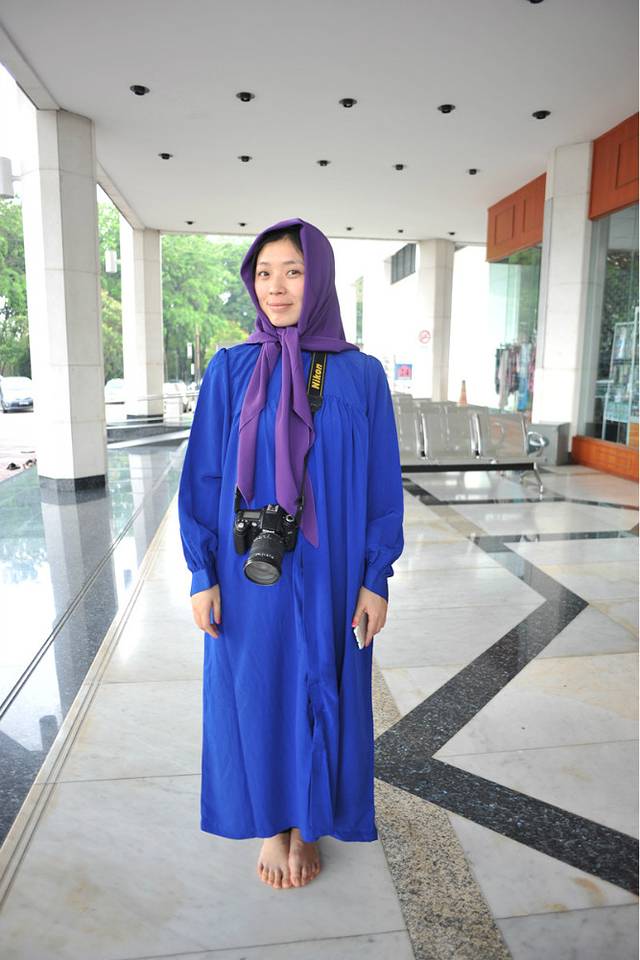 到清真寺之前,导游嘱咐大家一定不要穿得太露,男生不可以穿短裤。所以大家都穿的很规矩。到了门口,大家把鞋子脱在外面。女生也都穿上了寺外准备好的袍子。用头巾把头包起来,于是所有人都像双胞胎。