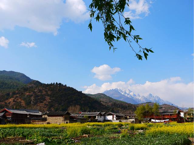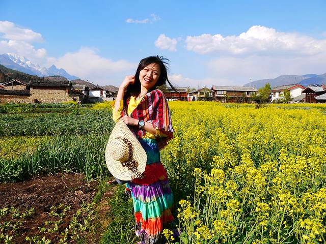 进入束河以后,走了一段时间,就看到一片油菜花田,远处就是玉龙雪山,蓝天白云,好美的风景。散落的几个小平房更添意境。