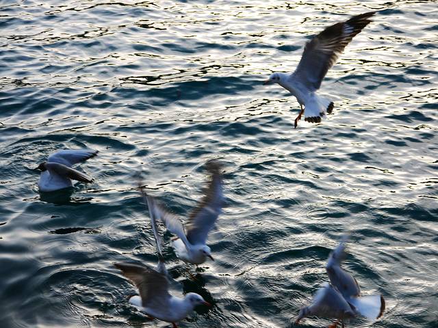 幸运的是,果真还存留着一小部分的红嘴鸥。买了两包专用粮食喂他们,看着一只只鸟儿在身边落下又飞起,亲近大自然的一刻真好。