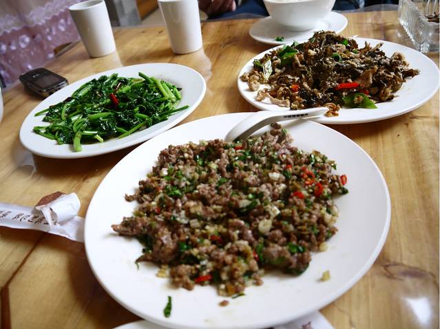 树皮炒肉(树皮有些苦不过据说对身体好,肉十分鲜嫩),金雀花(十分美味!)几个都是当地菜,很有特色。