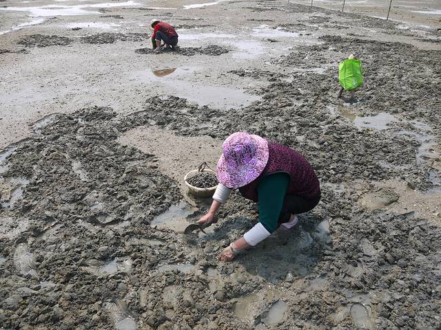 沙滩上很多当地的阿姨们在刨蛤蜊。