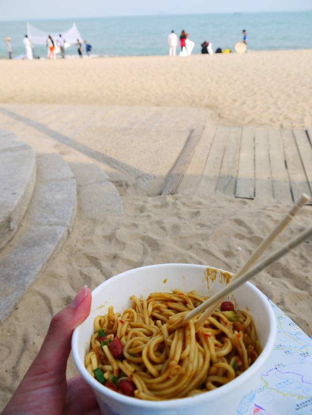 普陀寺出来,就是在厦门大学溜达。穿过厦门大学,就是沙滩了。沙滩的沙子真不怎么细致,和青岛、日照等山东沿海还是没法比的。不过有很多情侣在照婚纱照,还是满满的幸福。我买了份炒面和鸭翅膀,津津有味的吃着,看着大海,看着拍照的一对对情侣们,看着小孩子们玩沙子那纯真的笑容。