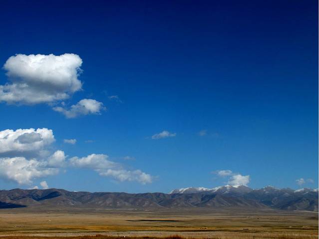 4、草原上天空中的云彩是变化无穷的。白云在蓝天的衬托下可形成很好的陪景。地面上羊群不多时,用高角度拍摄就显得零乱。这时应采用低角度拍摄,可使地面为数不多的羊群与空中的白云连成一体,相映生辉。