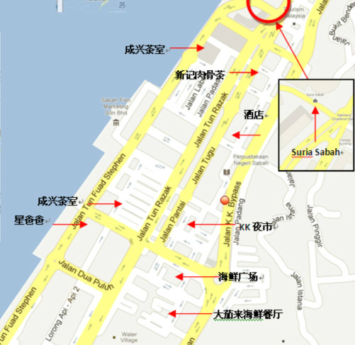 沙巴天桥可以算得上是一个地标,找到天桥就可以找到邮局、KK Plaza、沙巴菜市场等地方,所以大家找找看。