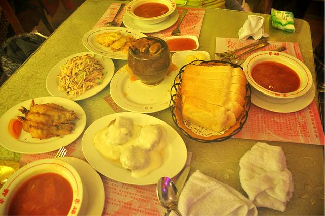 红菜汤(439) 罐焖牛肉(386) 面包(318) 软煎马哈鱼(291) 罐虾(291) 罐焖羊肉(200) 俄式沙拉(138) 酸黄瓜(127) 格瓦斯(100)