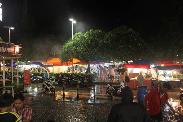 半小时之后,出门就下雨了。这条就是小吃街了 ,各种串 是各种!50B左右