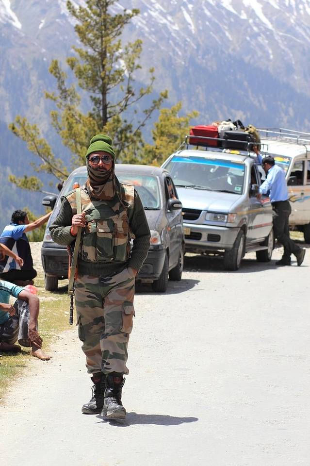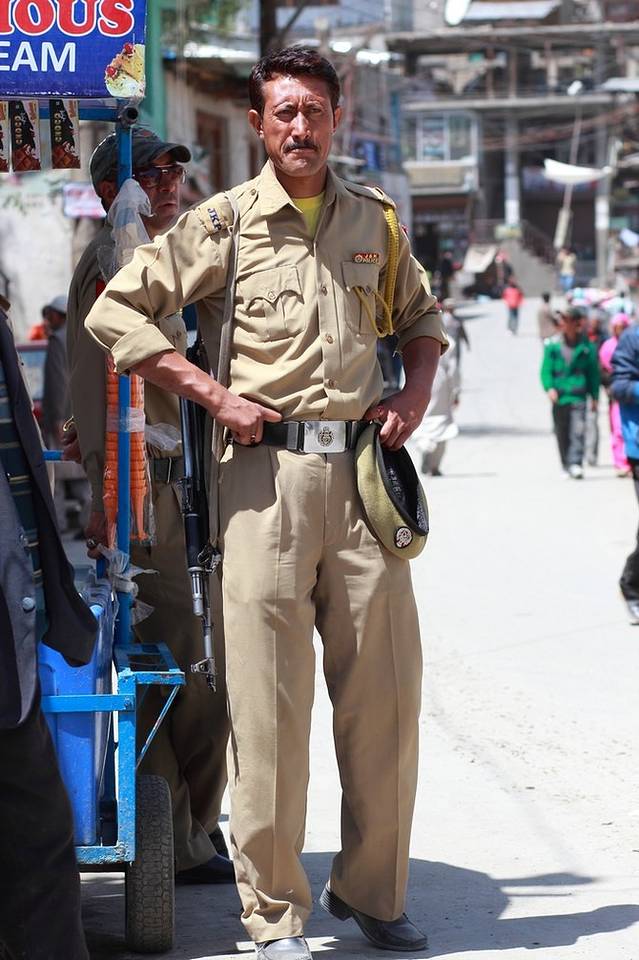 道路上一个个真枪实弹的站岗的印度士兵,给人一种局势紧张的感觉,后来证明这些大兵还是很友好的,面对我的镜头,完全不会生气,而且有时还很配合