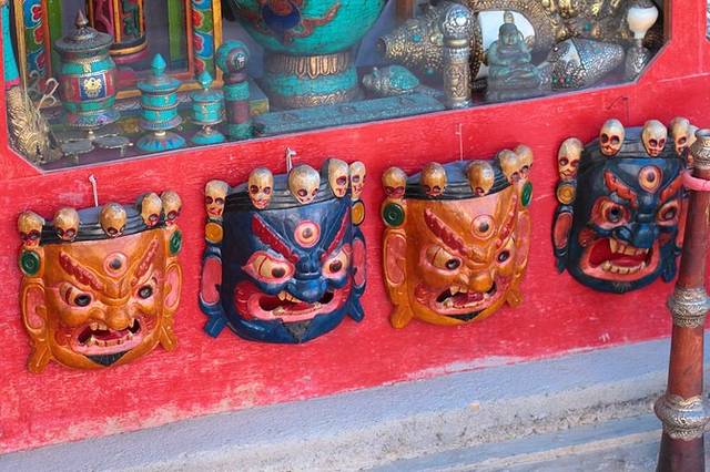 这些表情狰狞的面具据说有驱魔的功效,很多拉达克居民家里都挂有这种面具