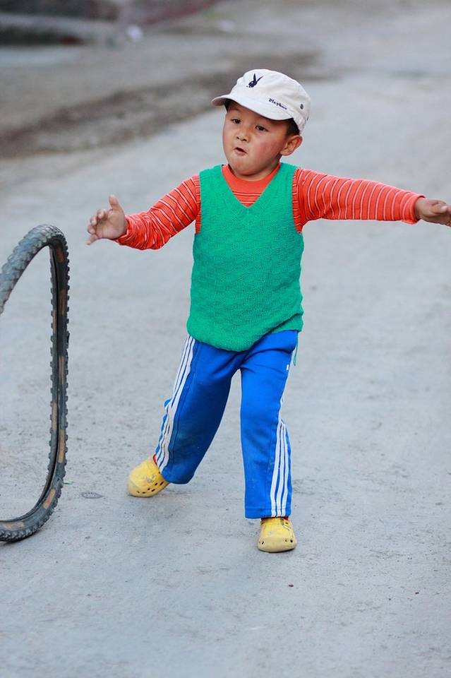 在这种偏远的山村里,即使一个破轮胎,也能让他们玩儿的津津有味。