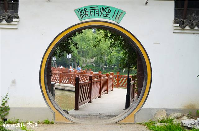 一早无风,河面平静,烟雨长廊还没有被游客填满。