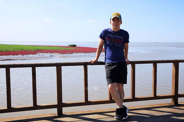 景区内的回廊留影。远处看到的半绿半红是叫做碱蓬草的植物,据说以前生活在周围的居民常常采吃,后来碱化以及维护环境的原因……食用的人几乎没有了,不过用来观赏,着实独具特色。