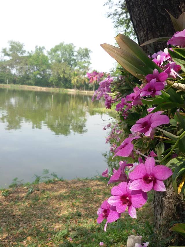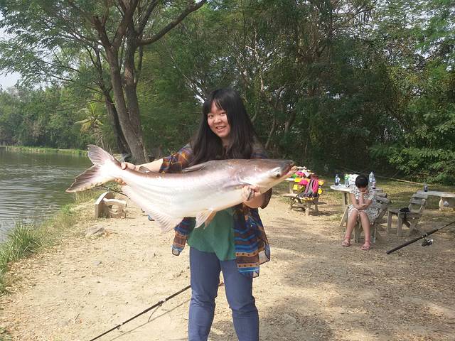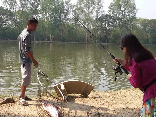 由于我们是3个女生,庄主的儿子全程跟着我们,教我们使用鱼竿,安排我们的午餐。