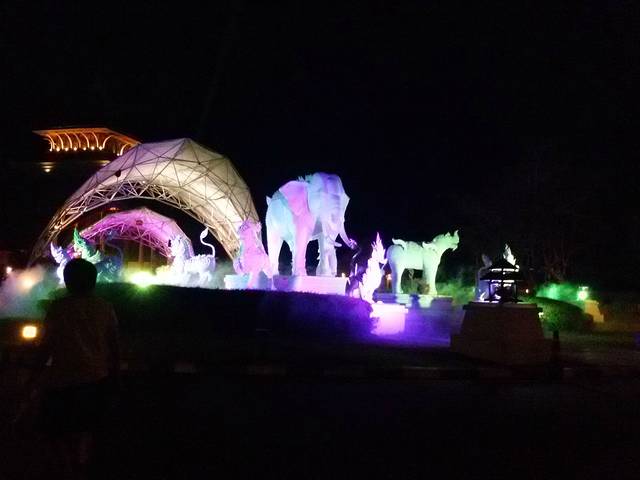 晚上我们向夜间动物园进发。门后这摆设确实有点吓人,还不断喷着水雾。