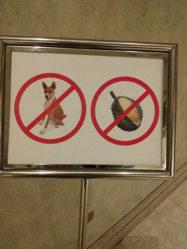 泰国一般酒店都会在电梯口竖着这个牌子,狗狗和榴莲带进房间一般要罚款2000B。