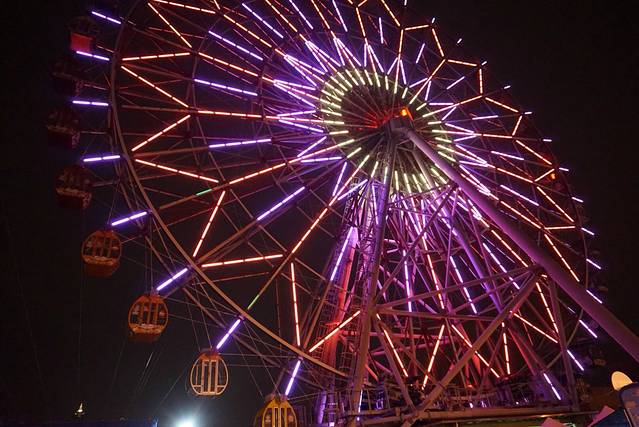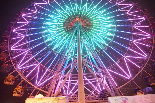 然後就坐捷運到夢時代廣場坐摩天輪去了捷運站到夢時代有段距離,但是會有接駁車免費送你過去哦。這個摩天輪是在夢時代購物中心頂樓,又叫高雄之眼。每個車廂都有可愛的卡通圖案哦,並且車廂內會有貼心廣播,介紹高雄的景色,女生一定很喜歡了,晚上來坐很浪漫哦。轉一圈只有15分鐘哦,要好好把握時間哦。