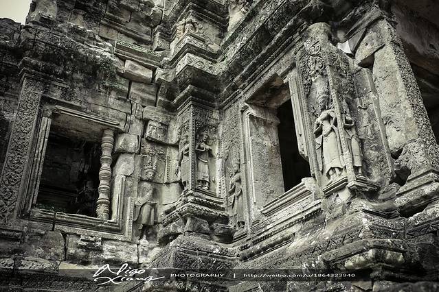 前护墙饰有7层精心制作的雕刻,包括无数的阿帕莎拉(apsara,舞女或者天仙)。更蔚为壮观的是前护墙后隐蔽的壕沟里那些表情邪恶的形象。数世纪前因为最初的坛台扩建,这些雕像被掩埋起来,所以现在看起来依然光鲜,就像昨天才雕刻出来的似的。