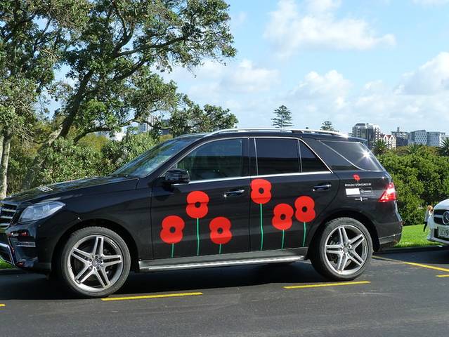 在纪念日当天到处都可以见到poppy花,人们会将纸或棉制的poppy花佩戴在胸前,用以悼念牺牲的战士们,下图车上的图案即为poppy: