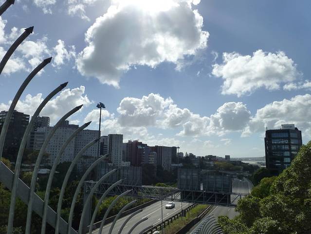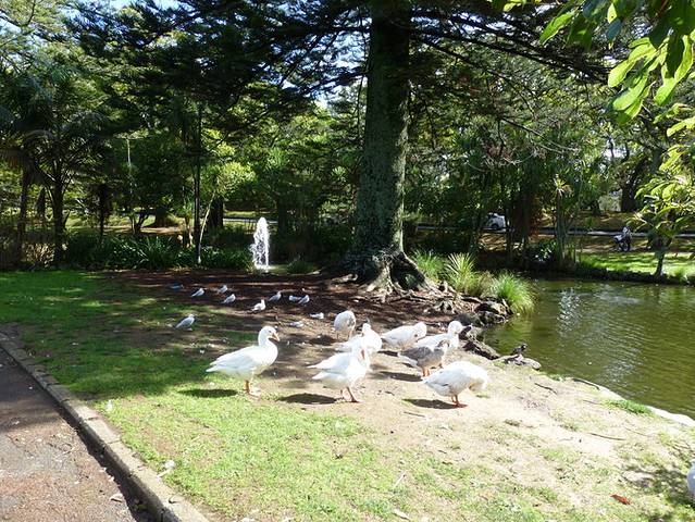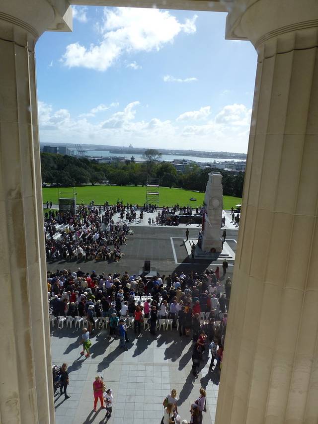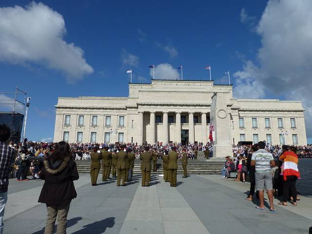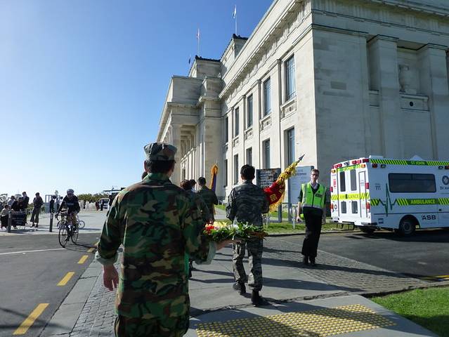 等bus的时候一个黑发男生跟我说 还有几分钟车就到了,他已经等了很久了。我说谢谢,寒暄几句,然后问他,r u Chinese? 他说yes,于是我们开始用中文聊天><,后来才听出来他是台湾人,我心想问台湾人是否Chinese,人家也不好回答啊!不过气氛还是很融洽的,他28岁工作几年后来新西兰读语言半年,说算是给自己的一个gift。他说这趟车去Museum最近的车站是University,多亏提醒,要不我就坐到City去了。下车之后互道拜拜,打开google map,我开始了暴走的一天!从University去Museum要穿过很大的一片公园,大片的绿地,好想变成一只狗然后在草地上打滚狂奔!但是我并没有停下来,继续暴走,因为约了Arwen十点在Museum门口见!下图白色建筑即为Museum,几个穿迷彩服、手举花&旗帜的思密达从我身边走过,是来参加纪念仪式的!