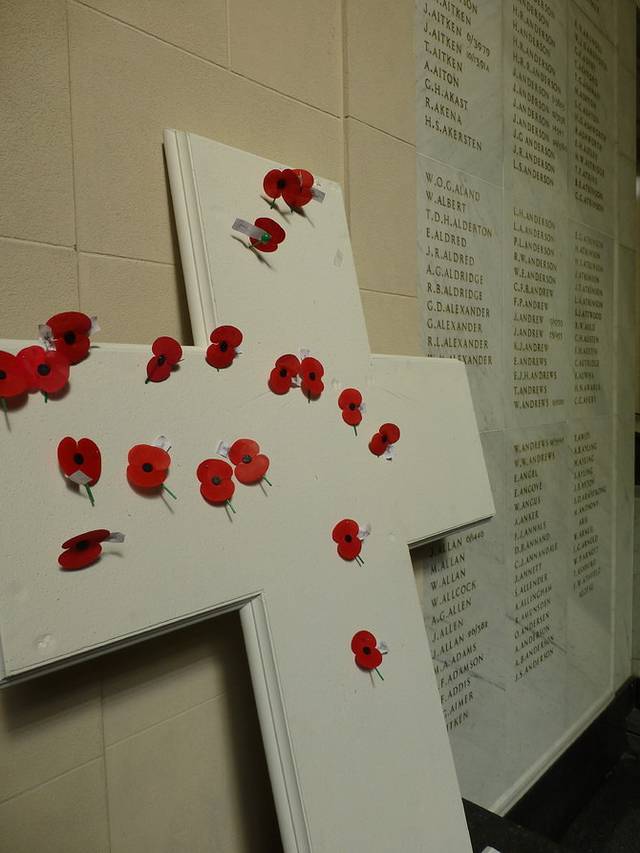 Museum内部有很多面大理石墙,墙上刻着在战争中牺牲的战士的名字,很多人将poppy花插在十字板上,以示怀念,也有人直接将花贴在名字的旁边,想必是战士的亲人、后代所为。