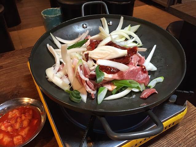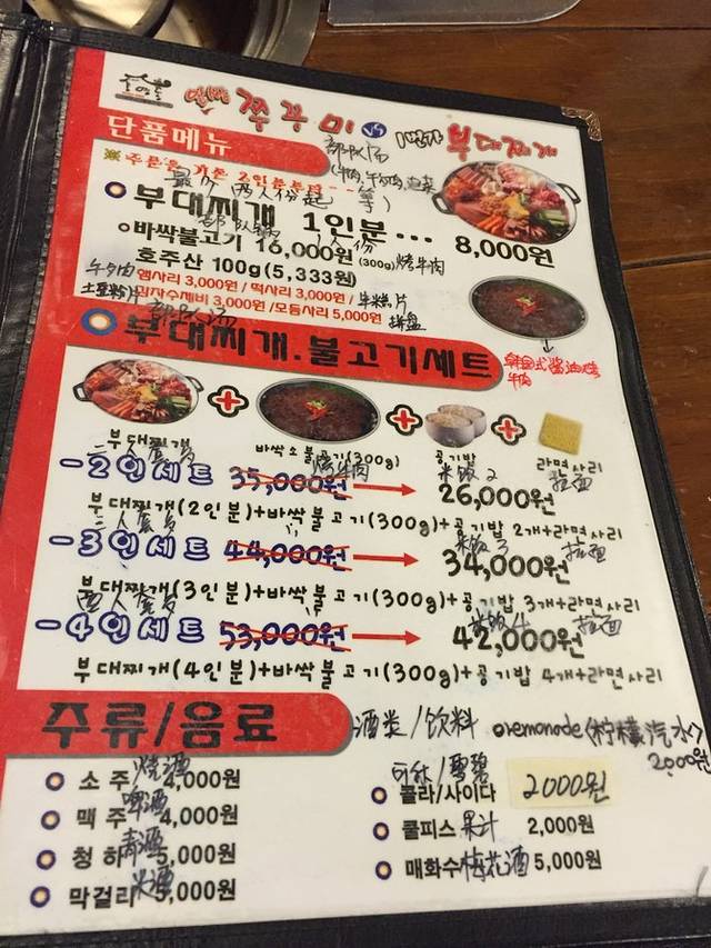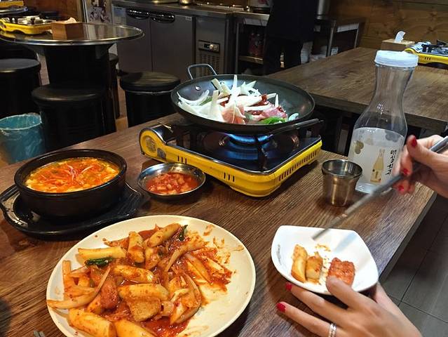 偶吧喊了好几天要吃部队锅 今晚终于圆了他的梦!在明洞逛街的某个路口 看到楼上写着牛骨部队锅!听着就好吃 于是上楼试试!点了下图中间部队锅+一盘烤牛肉+俩米饭+拉面=26000 点了瓶清酒~