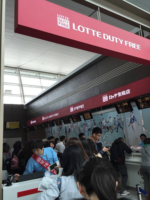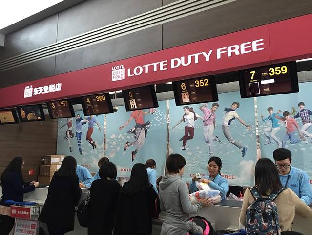 下图就是乐天免税店 提货的地儿!先跟这个带红条的小哥拿个排队号(没错就是跟吃海底捞似得!)然后等着电子指示牌叫号儿!别走远!很快就能叫到你!
