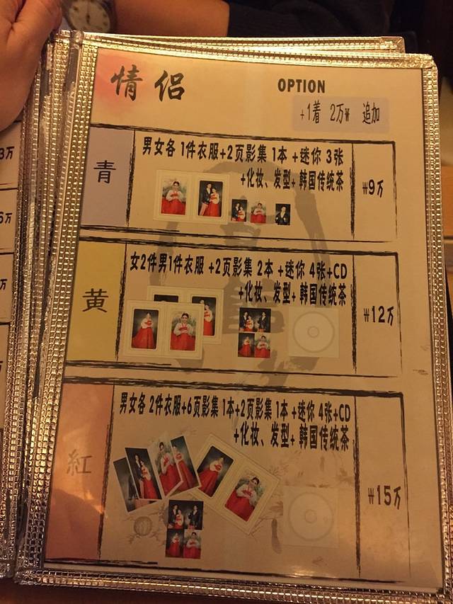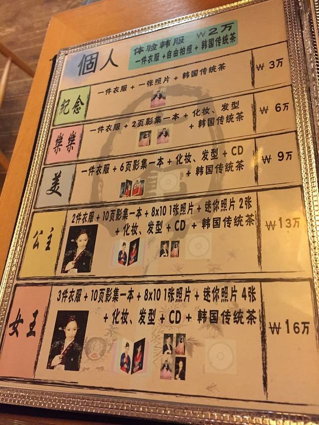 最贵的25万/3人内容:每人2件衣服+6页影集一本+2页影集3本+8x10 一张照片+5x7 三张照片+化妆 发型+CD+韩国传统茶