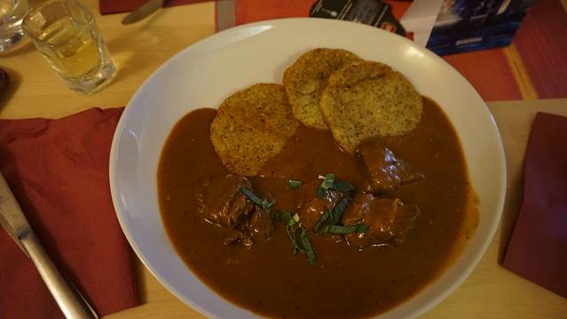 这个就是GOULASH了,3个薯饼,加上牛肉。当然GOULASH还有另一种形式,就是把牛肉汁倒在一个面包做的大碗中。